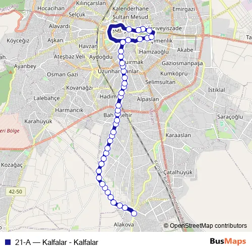 The first stop of the 21-A bus route is Alakova Son Durak and the last stop is Şerafettin Cami 2. 21-A (Kalfalar - Kalfalar) is operational during her gün.