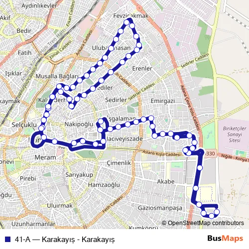 See why over 2 million users trust and consider busmaps.com as the best public transport website. busmaps gives you Karatay Buses suggested routes, real-time bus tracker, line route maps in Karatay, and helps to find the closest 41-A bus stops near you. No internet available? Download an offline PDF map and bus schedule for the 41-A bus to take on your trip.