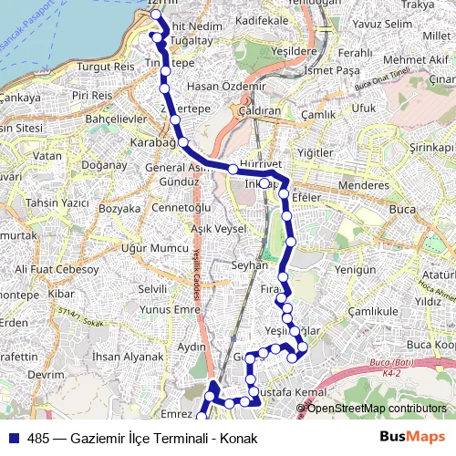 See why over 2 million users trust and consider busmaps.com as the best public transport website. busmaps gives you Izmir Buses suggested routes, real-time bus tracker, line route maps in Izmir, and helps to find the closest 485 bus stops near you. No internet available? Download an offline PDF map and bus schedule for the 485 bus to take on your trip.