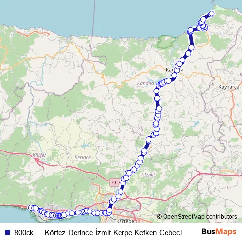 The first stop of the 800ck bus route is Körfez Belediyesi and the last stop is Cebeci 2. 800ck (Körfez-Derince-İzmit-Kerpe-Kefken-Cebeci) is operational during hafta içi.
