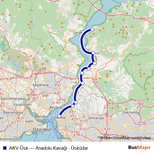 The first stop of the AKV-Üsk ferry route is Üsküdar Şh. and the last stop is Anadolu Kavağı Şh.. AKV-Üsk (Anadolu Kavaği - Üsküdar) is operational during hafta içi.