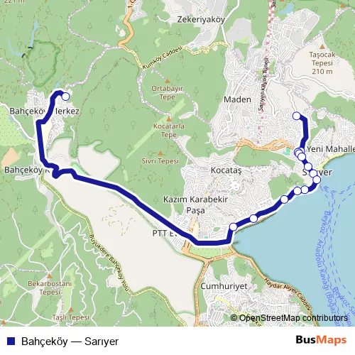The first stop of the Bahçeköy bus route is Maden Deresi and the last stop is Hunca Caddesi. Bahçeköy (Sarıyer) is operational during her gün.