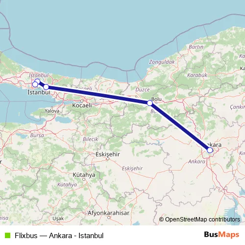The first stop of the Flixbus bus route is Ankara, Ankara bus station and the last stop is Istanbul, Istanbul Esenler. Flixbus (Ankara - Istanbul) is operational during her gün.