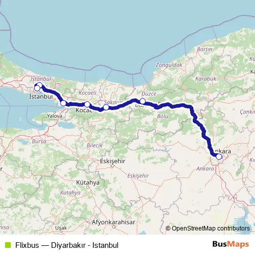 The first stop of the Flixbus bus route is Ankara bus station and the last stop is