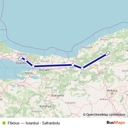 The first stop of the Flixbus bus route is Istanbul, Istanbul Esenler and the last stop is Safranbolu, Safranbolu bus station. Flixbus (Istanbul - Safranbolu) is operational during her gün.