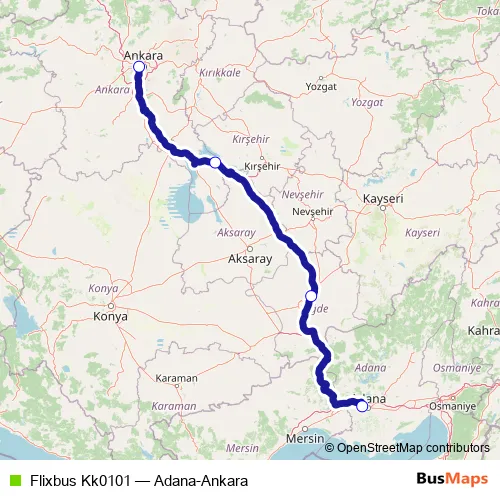 The first stop of the Flixbus Kk0101 bus route is Ankara bus station and the last stop is Adana bus station. Flixbus Kk0101 (Adana-Ankara) is operational during her gün.