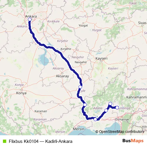 The first stop of the Flixbus Kk0104 bus route is Kadirli bus station and the last stop is Ankara bus station. Flixbus Kk0104 (Kadirli-Ankara) is operational during her gün.