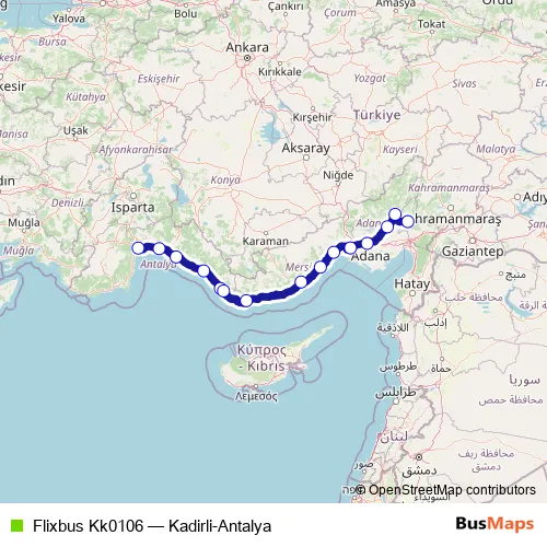 The first stop of the Flixbus Kk0106 bus route is Mersin bus station and the last stop is Kadirli bus station. Flixbus Kk0106 (Kadirli-Antalya) is operational during her gün.