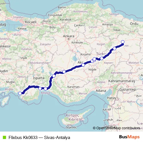 The first stop of the Flixbus Kk0633 bus route is Fethiye bus station and the last stop is Sivas bus station. Flixbus Kk0633 (Sivas-Antalya) is operational during her gün.