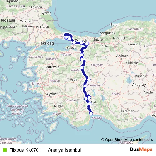 The first stop of the Flixbus Kk0701 bus route is Afyon bus station and the last stop is Antalya bus station. Flixbus Kk0701 (Antalya-Istanbul) is operational during her gün.
