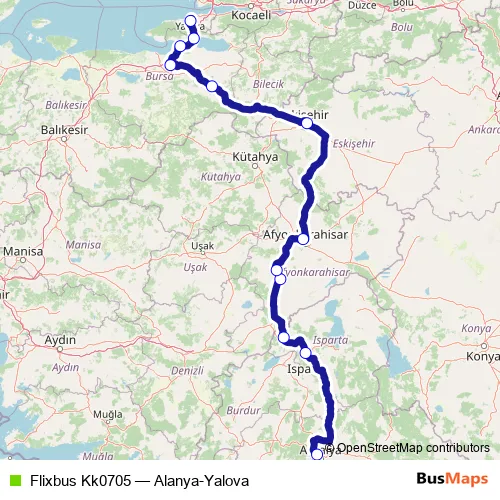 The first stop of the Flixbus Kk0705 bus route is Antalya bus station and the last stop is Yalova bus station. Flixbus Kk0705 (Alanya-Yalova) is operational during her gün.