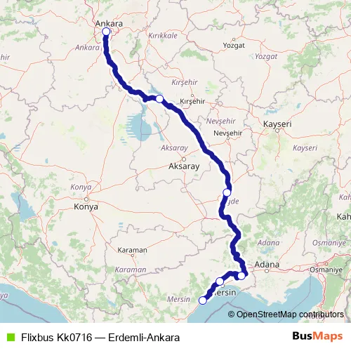 The first stop of the Flixbus Kk0716 bus route is Erdemli bus station and the last stop is Ankara bus station. Flixbus Kk0716 (Erdemli-Ankara) is operational during her gün.