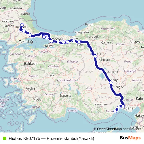 The first stop of the Flixbus Kk0717b bus route is Ankara bus station and the last stop is İstanbul Esenler bus station. Flixbus Kk0717b (Erdemli-İstanbul(Yasaklı)) is operational during her gün.