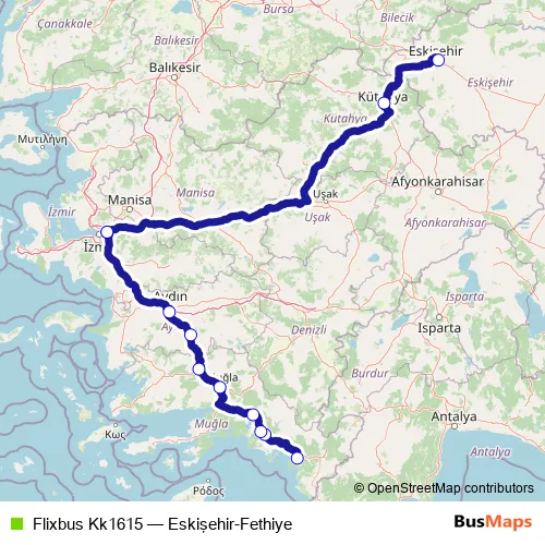 The first stop of the Flixbus Kk1615 bus route is Fethiye bus station and the last stop is Eskisehir bus station. Flixbus Kk1615 (Eskişehir-Fethiye) is operational during her gün.