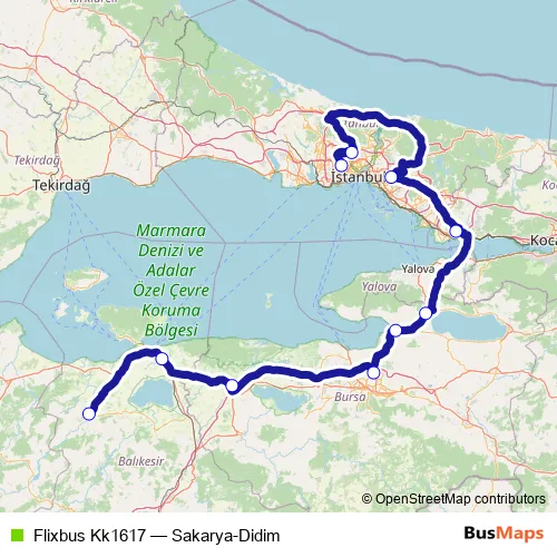 The first stop of the Flixbus Kk1617 bus route is İstanbul Esenler bus station and the last stop is Gönen bus station. Flixbus Kk1617 (Sakarya-Didim) is operational during her gün.