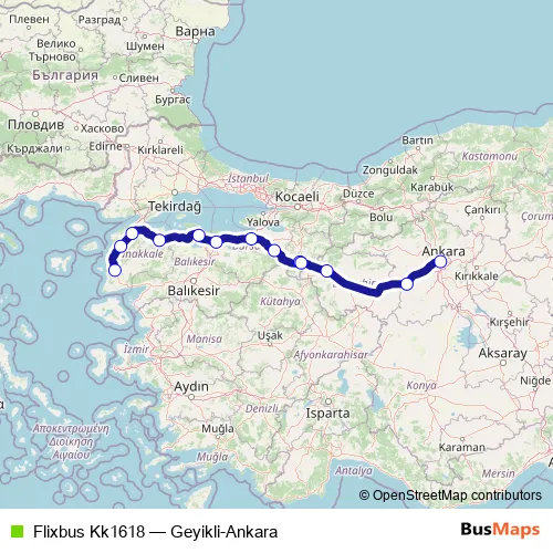 The first stop of the Flixbus Kk1618 bus route is Ezine bus station and the last stop is Ankara bus station. Flixbus Kk1618 (Geyikli-Ankara) is operational during her gün.