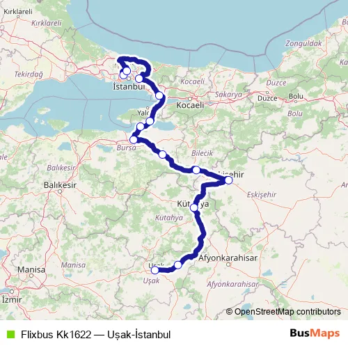 The first stop of the Flixbus Kk1622 bus route is İstanbul Esenler bus station and the last stop is Uşak bus station. Flixbus Kk1622 (Uşak-İstanbul) is operational during her gün.