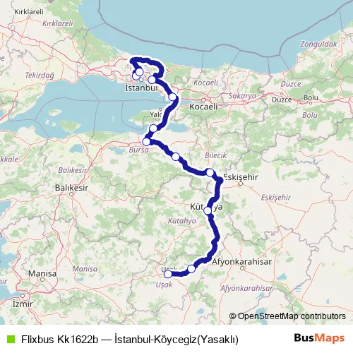 The first stop of the Flixbus Kk1622b bus route is İstanbul Esenler bus station and the last stop is Uşak bus station. Flixbus Kk1622b (İstanbul-Köycegiz(Yasaklı)) is operational during her gün.