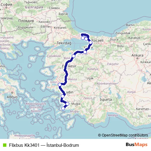 The first stop of the Flixbus Kk3401 bus route is Bodrum bus station and the last stop is İstanbul Esenler bus station. Flixbus Kk3401 (İstanbul-Bodrum) is operational during her gün.