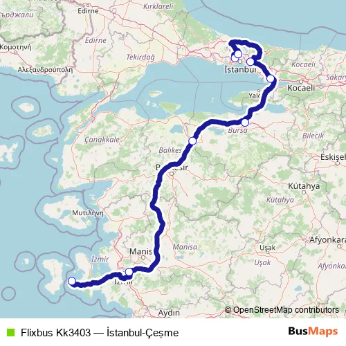 The first stop of the Flixbus Kk3403 bus route is İstanbul Esenler bus station and the last stop is Çeşme bus station. Flixbus Kk3403 (İstanbul-Çeşme) is operational during her gün.
