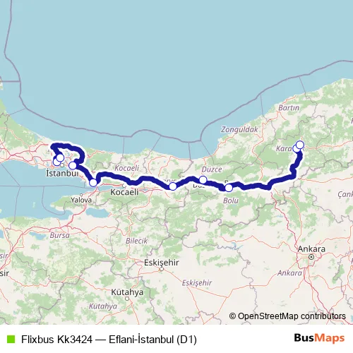 The first stop of the Flixbus Kk3424 bus route is İstanbul Esenler bus station and the last stop is Safranbolu bus station. Flixbus Kk3424 (Eflani-İstanbul (D1)) is operational during her gün.