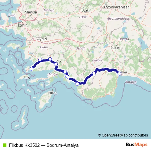 The first stop of the Flixbus Kk3502 bus route is Bodrum bus station and the last stop is