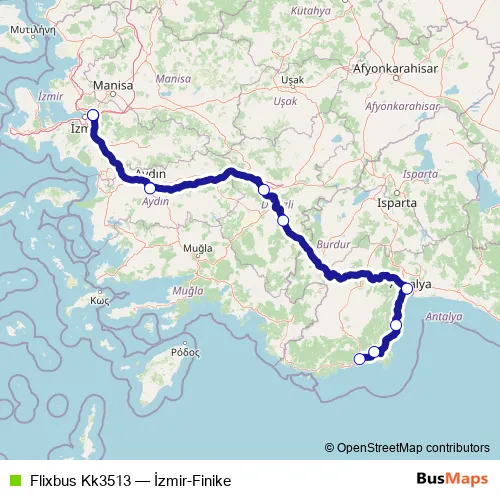 The first stop of the Flixbus Kk3513 bus route is Izmir Otogar Tesis and the last stop is Finike bus station. Flixbus Kk3513 (İzmir-Finike) is operational during her gün.