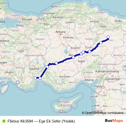 The first stop of the Flixbus Kk3594 bus route is Fethiye bus station and the last stop is