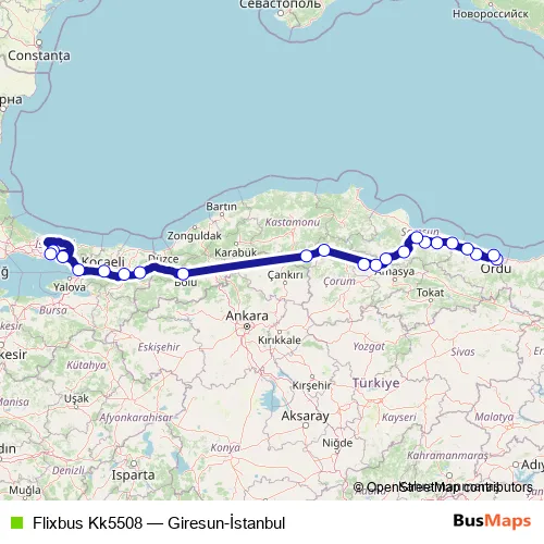 The first stop of the Flixbus Kk5508 bus route is Ordu bus station and the last stop is