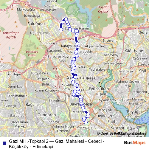 Bus Gazi MH.-Topkapi 2 - Gazi Mahallesi - Cebeci - Küçükköy - Edirnekapi Schedule in Istanbul