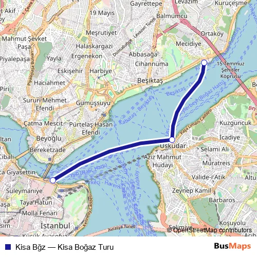 The first stop of the Kisa Bğz ferry route is Eminönü-Kadıköy Şh. and the last stop is Ortaköy Şh.. Kisa Bğz (Kisa Boğaz Turu) is operational during hafta sonu.