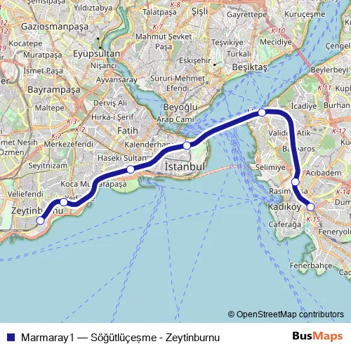 See why over 2 million users trust and consider busmaps.com as the best public transport website. busmaps gives you Istanbul Metro Lines suggested routes, real-time bus tracker, line route maps in Istanbul, and helps to find the closest Marmaray1 metro stops near you. No internet available? Download an offline PDF map and bus schedule for the Marmaray1 metro to take on your trip.