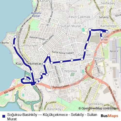 The first stop of the Soğuksu-Basinköy bus route is Sefaköy and the last stop is Soğuksu. Soğuksu-Basinköy (Küçükçekmece - Sefaköy - Sultan Murat) is operational during her gün.