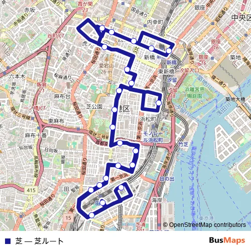 The first stop of the 芝 bus route is 港公园芝浦 and the last stop is 新桥站. 芝 (芝ルート) is operational during 每天.