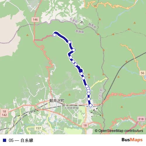 The first stop of the 05 bus route is 白糸の滝 and the last stop is 軽井沢駅北口. 05 (白糸線) is operational during 每天.