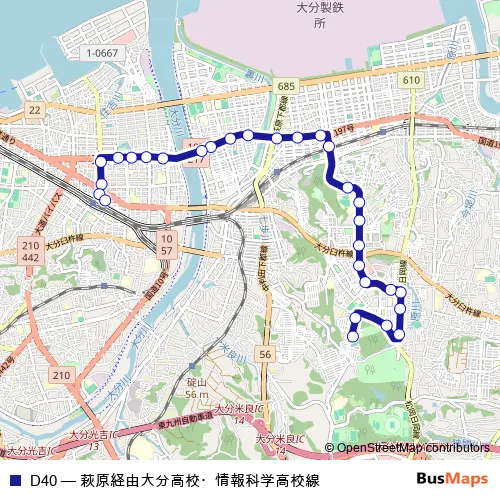 The first stop of the D40 bus route is 大分高校前 and the last stop is 要町. D40 (大分高中/信息科学高中线经由萩原) is operational during 每天.