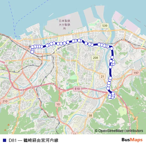 The first stop of the D81 bus route is 宫河内团地一丁目 and the last stop is 大分站前. D81 (鹤崎经由宫河内线) is operational during 每天.