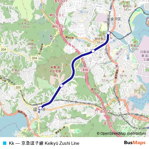 The first stop of the Kk rail route is 金泽八景 and the last stop is 逗子·葉山. Kk (京急逗子线) is operational during 每天.