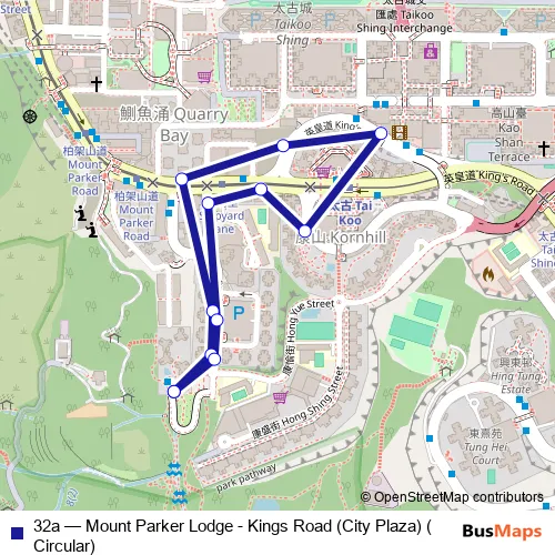 The first stop of the 32a bus route is Hong PAK Path, Near MT Parker Lodge Block A and the last stop is Hong PAK Path, Near MT Parker Lodge Block A. 32a (Mount Parker Lodge - Kings Road (City Plaza) (Circular)) is operational during 每天.