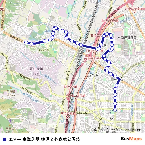 The first stop of the 359 bus route is TC 捷運文心森林公園站(文心路) and the last stop is TC 東海別墅. 359 (東海別墅 捷運文心森林公園站) is operational during 每天.
