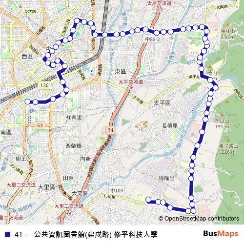 See why over 2 million users trust and consider busmaps.com as the best public transport website. busmaps gives you Taichung Buses suggested routes, real-time bus tracker, line route maps in Taichung, and helps to find the closest 41 bus stops near you. No internet available? Download an offline PDF map and bus schedule for the 41 bus to take on your trip.