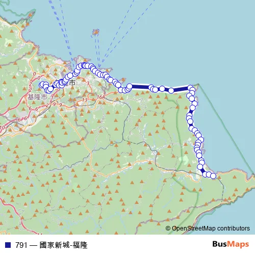The first stop of the 791 bus route is 國家新城 and the last stop is 福隆. 791 (國家新城-福隆) is operational during 每天.