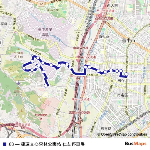 The first stop of the 83 bus route is TC 捷運文心森林公園站(文心路) and the last stop is TC 仁友停車場. 83 (捷運文心森林公園站 仁友停車場) is operational during 每天.