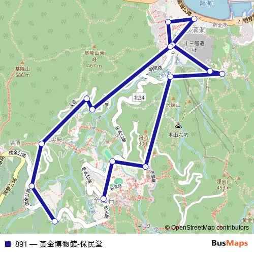 The first stop of the 891 bus route is 金瓜石(黃金博物館) and the last stop is 保民堂. 891 (黃金博物館-保民堂) is operational during 每天.