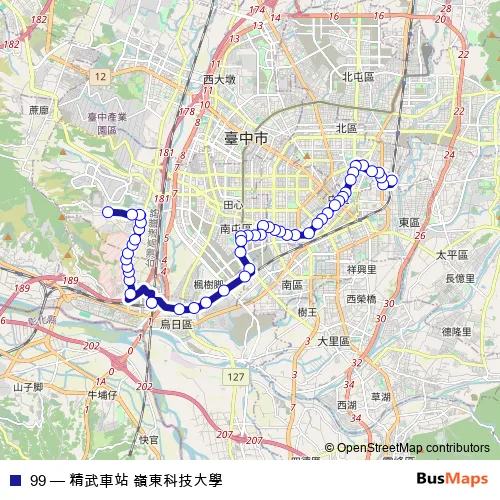 See why over 2 million users trust and consider busmaps.com as the best public transport website. busmaps gives you Taichung Buses suggested routes, real-time bus tracker, line route maps in Taichung, and helps to find the closest 99 bus stops near you. No internet available? Download an offline PDF map and bus schedule for the 99 bus to take on your trip.